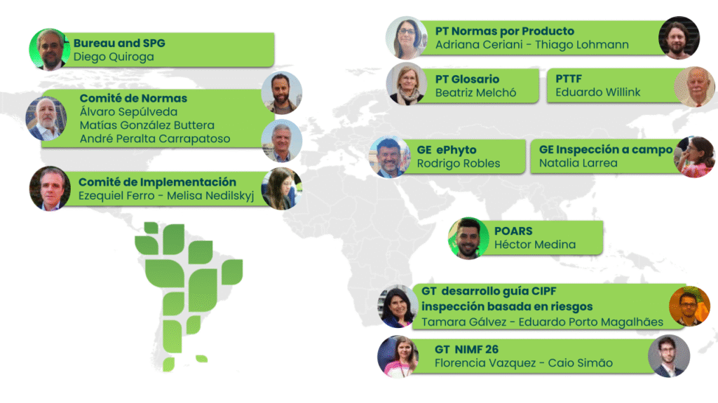 Así, históricamente, representantes regionales participan en la elaboración de normas internacionales de protección fitosanitaria y sus anexos, tratamientos fitosanitarios, definiciones o términos fitosanitarios y comparten la experiencia de la región y sus ONPF en temas de interés internacional.